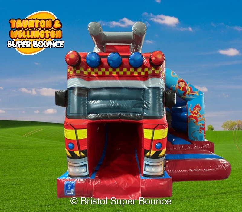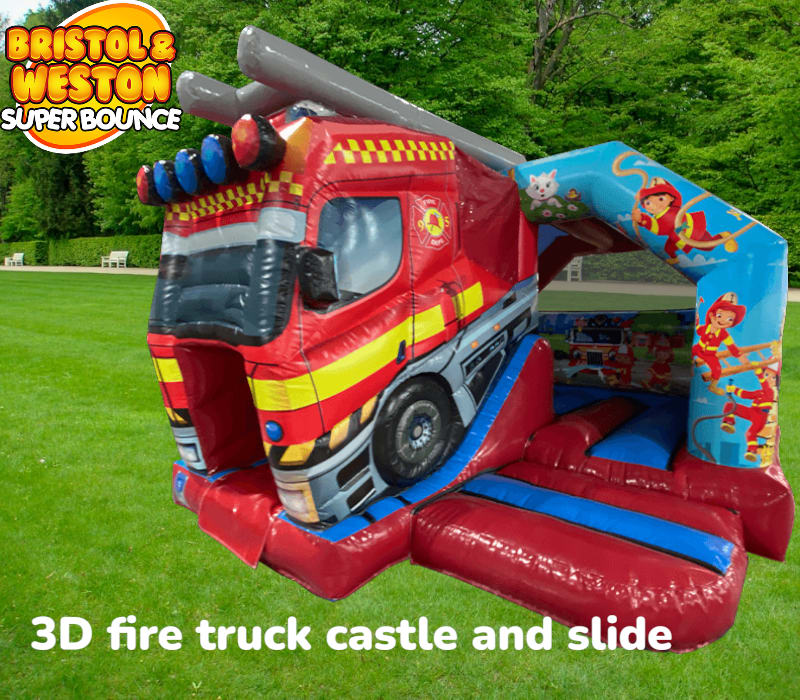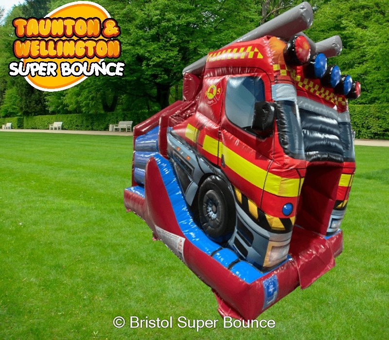 Inflatable hire 3D Fire engine castle and slide in Taunton, Wellington, Bridgwater, Weston super mare, Clevedon, Nailsea, Portishead, Bristol, Bath, Gloucester and surrounding areas delivers a bold, safe and memorable attraction for parties, fetes and community events. Bright colours and a realistic 3D fire truck front create instant excitement. Kids climb, slide and role-play like mini firefighters. 🔥