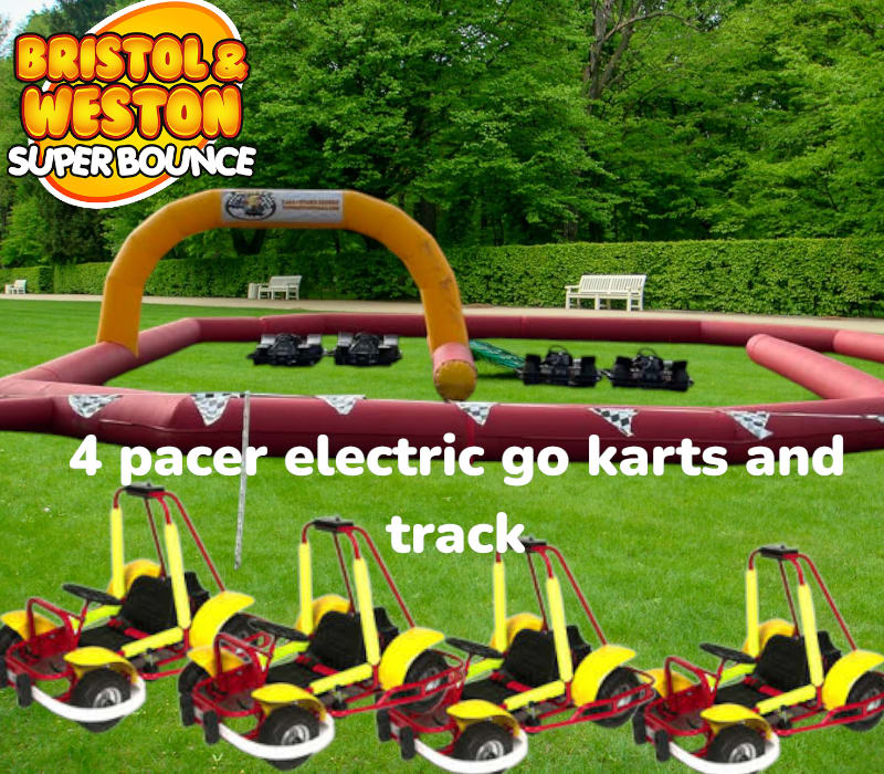 go kart hire 2 hours 4 x pacer go karts with track in Wellington, Taunton, Weston super mare, Clevedon, Portishead, Bristol, Bath and south west — Perfect for Go kart parties and events. Let kids aged 4–10 drive electric Pacer go karts on a cushioned inflatable track. Short setup. Big smiles. Safe speeds. Great for birthdays and community events.