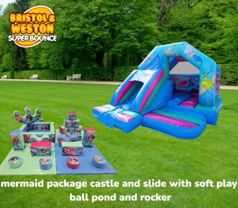 Make every little girl's dream come true with the Mermaid Package. Bright mermaid graphics, a front slide and a roomy bounce area create instant wow-factor. This bundle combines a premium bouncy castle with a 19-piece mermaid soft play set for safe, colourful fun. Perfect for mermaid parties, events and play schools. 🐚🏰